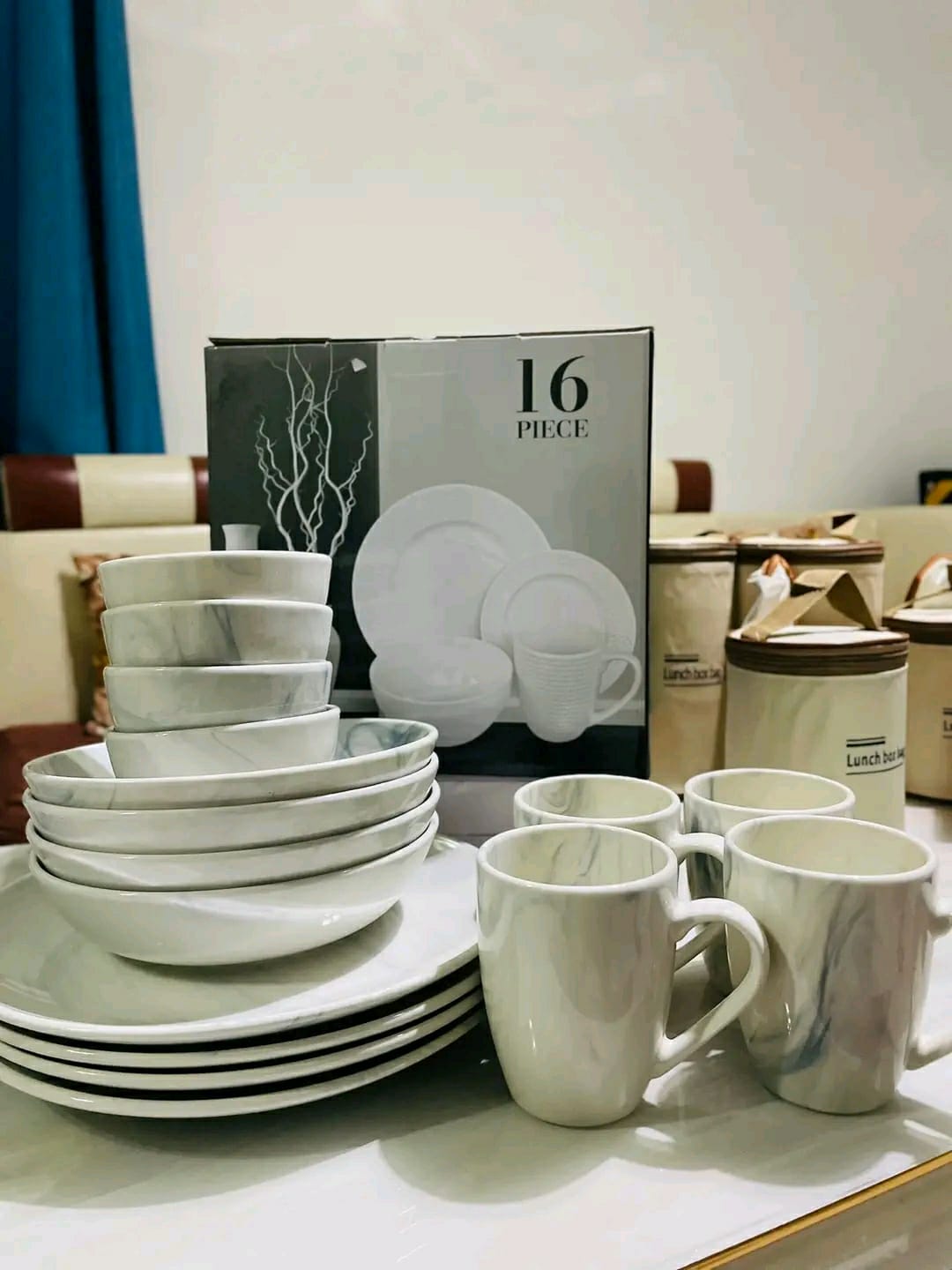 Service de table élégant de 16 pieces idéal pour usage quotidienne ou pour recevoir conçue avec finition moderne effet marbre ce set comprend des assiette bols et tasses assortis résistant et facile à entretenir