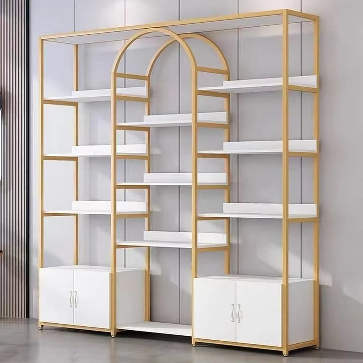 Etagere moderne en structure métallique dorée avec plateaux blancs dotée d'un designe en arc élégant au centre idéal pour le rangement et la décoration avec plusieur niveaux et placard fermés en partie base dimension 2m/175/30