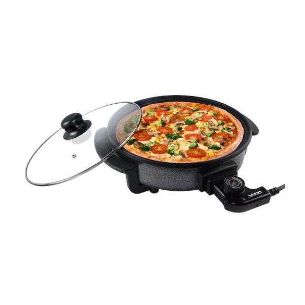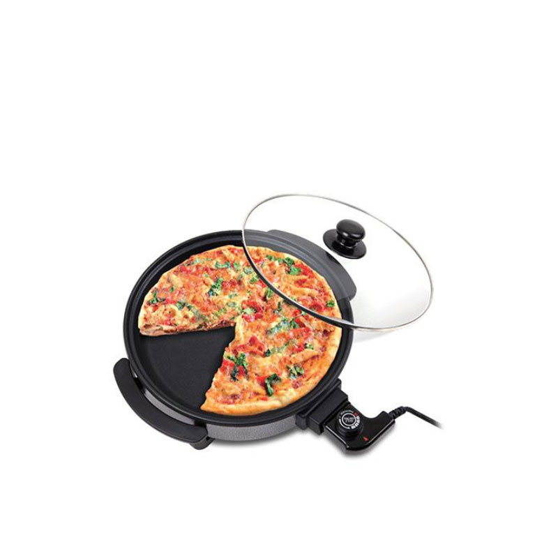Pizza pan électrique avec surface anthiadhesive et temperature réglable idéal pour cuire pizza et divers plats rapidement et uniformémént équipée d'un couvercle en verre pour surveiller la cuisson et facile à nettoye